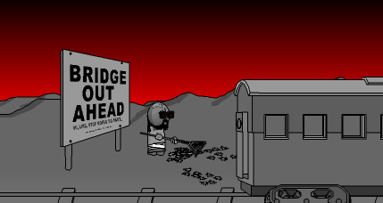Jeb only made a cameo in this episode. While Hank and Tricky were fighting on the train, he was seen in front of the "Bridge Out" sign raking leaves while wearing a shirt that said, "I'm Jebus, lol. This is as dressed up as I get." His halo was absent, and his goatee had grown into a full beard. He stopped raking for a moment when he noticed the mysterious train, but shrugged it off and continued.