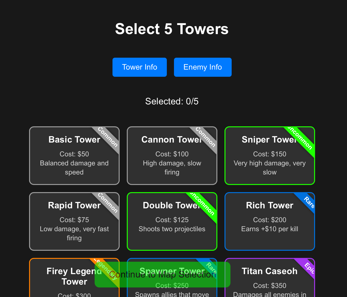 Once the player has chosen all 5 towers, the continue to map selection button will light up green and once clicked it will instantly take the player to the map selection.