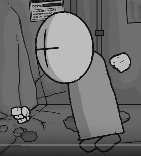 A grunt is seen banging his head against a wall due to some kind of pain, interrupted by a force seizing him and smashing him against the wall. Additionally, grunts from scenes in Madness Combat 3 appear in red images that were triggered by Deimos touching Hank's old body outside The Bakery!.